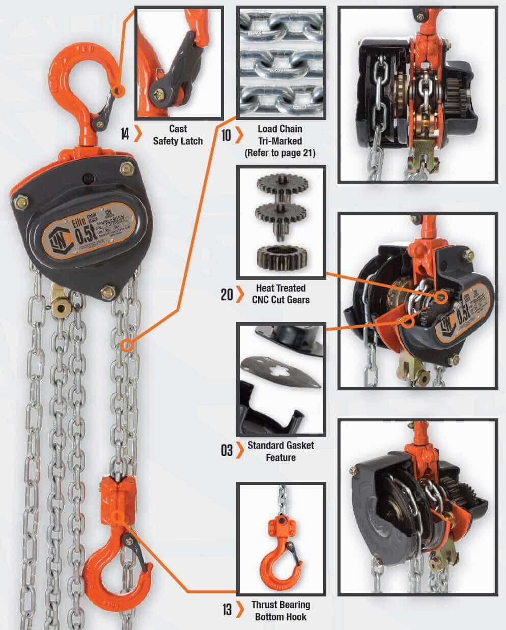 The Elite Chain Block (Industrial) range includes a load chain stopper to prohibit load chain lift height over extension. Asbestos free brake and friction discs.